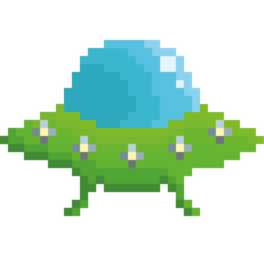 Pixel art d'un ovni en forme de chevron. Pixel art d'un ovni en forme de boule de feu. Pixel art d'un ovni en forme de cube. Pixel art d'un ovni en forme de disque. Pixel art de plusieurs ovnis en formation. Pixel art d'un ovni en forme de flash.